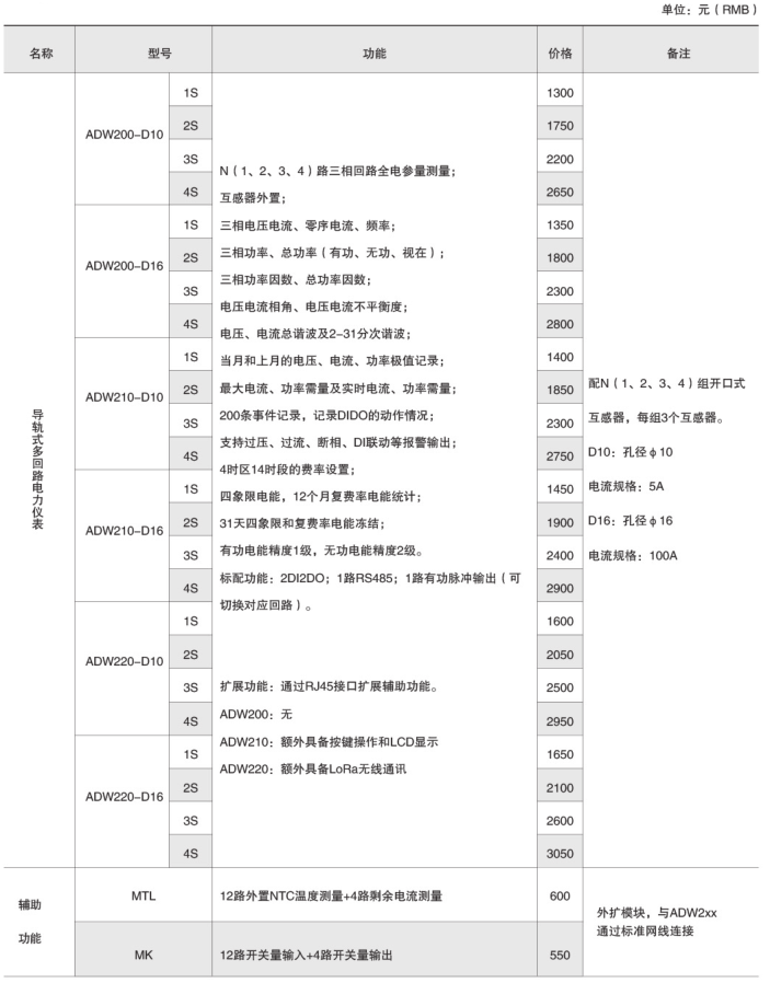 ADW2xx系列導軌式多回路電力儀表方便用戶進行用電監測、集抄和管理。可靈活安裝于配電箱內,實現對不同區域和不同負荷的分項電能計量,統計和分析。訂貨范例:
