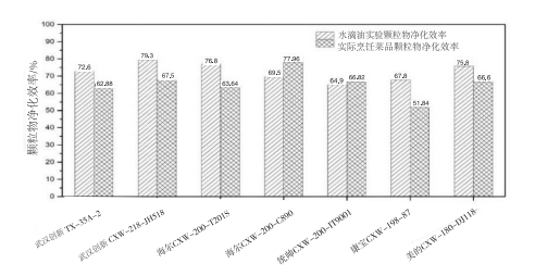 從圖5和圖6可以看出,兩種工況下所測得的油脂凈化效率一致性較好,而顆粒物凈化效率的數(shù)據(jù)存在一定程度的偏差。對實(shí)驗(yàn)過程進(jìn)行分析可知,實(shí)際烹飪菜品所排固態(tài)污染物中,除油脂小液滴以外,有相當(dāng)一部分是食物中有機(jī)質(zhì)熱氧化或熱裂解產(chǎn)生的固態(tài)顆粒物;而水滴油實(shí)驗(yàn)所排固態(tài)物中主要為油脂小液滴,其它顆粒物所占比重很小。因此,在油煙中油脂含量較高的情況下,采用紅外紅外分光光度法測得的實(shí)驗(yàn)數(shù)據(jù)在理論上要比稱重法測得的數(shù)據(jù)相對更為可靠。因此,在對水滴油實(shí)驗(yàn)和實(shí)際烹飪菜品兩種工況所測數(shù)據(jù)進(jìn)行比較時(shí),以油脂凈化效率表征的固態(tài)污染物凈化效果顯示出更好的一致性。通過以上結(jié)論,在制定《家用吸油煙機(jī)污染物排放標(biāo)準(zhǔn)》時(shí)可以考慮將水滴油實(shí)驗(yàn)方法作為標(biāo)準(zhǔn)方法,對吸油煙機(jī)固態(tài)污染物凈化效率進(jìn)行測試。