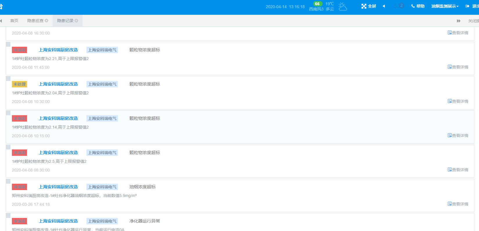 系統(tǒng)根據(jù)采集的油煙數(shù)值大小,產(chǎn)生對應(yīng)的排放超標(biāo)告警;對凈化器的運(yùn)行數(shù)據(jù)分析,上傳凈化設(shè)備對應(yīng)的運(yùn)行、停機(jī)、故障等告警事件。