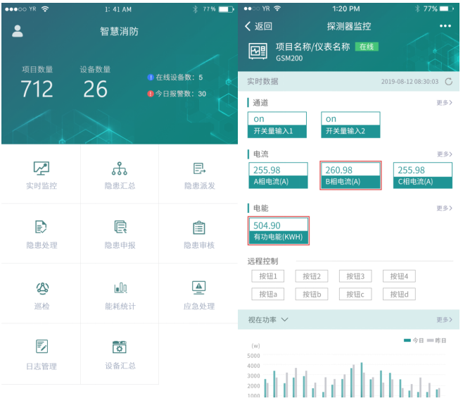 APP支持Android、iOS操作系統,方便用戶查看電氣火災、防排煙、消防水、消防設備電源、防火門、消防設備管理、視頻監控、火災報警等子系統的實時監控數據、報警信息、能耗統計等。