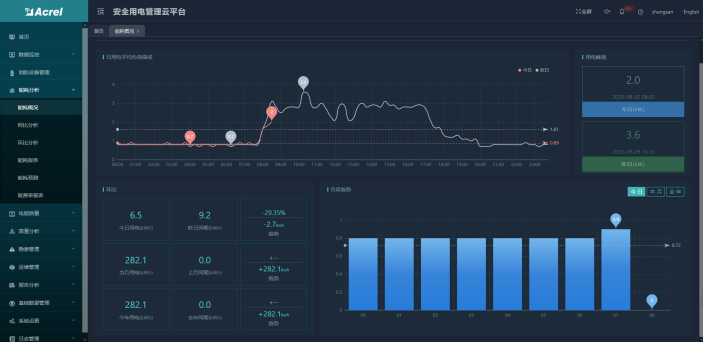 平臺可按照配電回路、區域、分項、部門統計日、月、年用電數據,并進行同環比分析,同時系統提供分時段電能及費用統計、實時需量、四象限電能、平均功率因數計算等功能,為用戶提供多維度數據服務。
