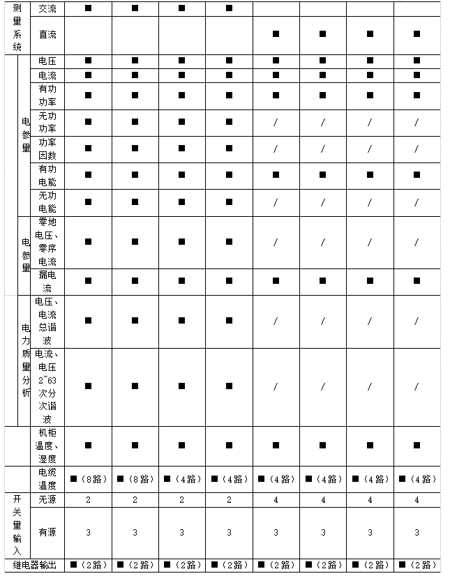 遙測:三相電壓、電流、有功功率、無功功率、視在功率、功率因數、有功電能、無功電能、電纜溫度,系統頻率、零序電流、零地電壓、漏電流、機柜溫度、機柜濕度、開關狀態、電壓/電流諧波含量、電流/功率;