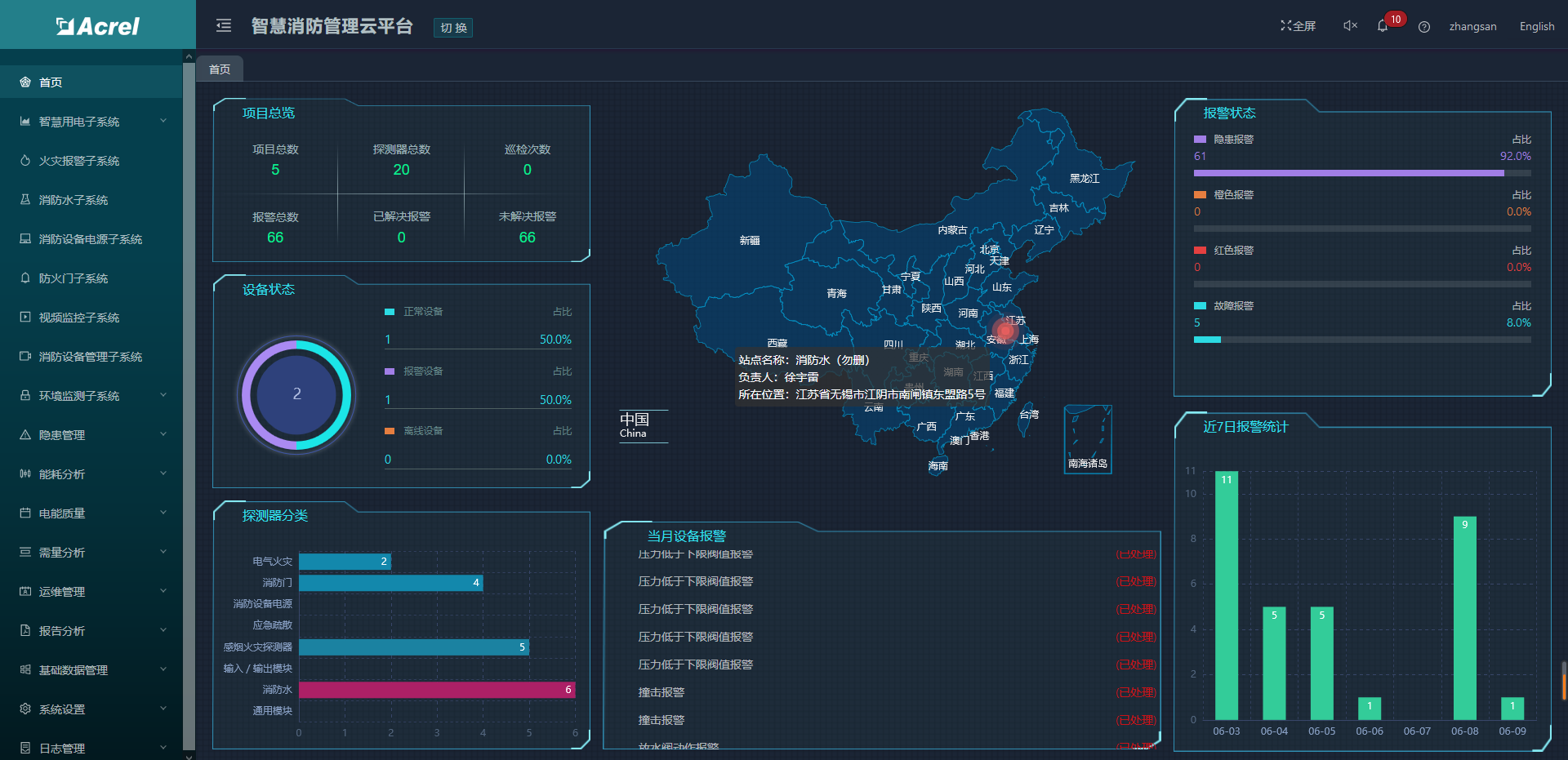 安科瑞智慧用電管理云平臺基于物聯網、大數據、云計算等現代信息技術,將分散的火災自動報警設備、電氣火災監(jiān)控設備、智慧煙感探測器、智慧消防用水等設備連接形成網絡,并對這些設備的狀態(tài)進行智能化感知、識別、定位,實時動態(tài)采集消防信息,通過云平臺進行數據分析、挖掘和趨勢分析,幫助實現科學預警火災、網格化管理、落實多元責任監(jiān)管等目標。實現了無人化值守智慧消防,實現智慧消防“自動化”、“智能化”、“系統化”、用電管理“精細化”的實際需求。