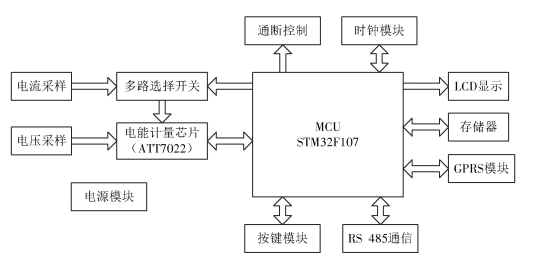 本系統(tǒng)采用模塊化思想,由電源模塊、信號采集處理模塊、MCU控制模塊、通信模塊及顯示、存儲、時(shí)鐘、按鍵等外圍模塊組成。該系統(tǒng)采用互感方式將電路中的大電流電壓信號轉(zhuǎn)換成小信號經(jīng)多路選擇開關(guān)切換電壓、電流采樣輸出信號,采用專用計(jì)量芯片ATT7022,實(shí)現(xiàn)對多用戶電壓電流信號采集,然后以STM32F107為主控制器,對采樣數(shù)據(jù)進(jìn)行處理。顯示模塊主要直觀顯示用戶用電信息。RS485通信模塊實(shí)現(xiàn)與數(shù)據(jù)管理中心之間的數(shù)據(jù)傳輸和相關(guān)指令的接收。時(shí)鐘模塊為電能表提供時(shí)間基準(zhǔn),為實(shí)現(xiàn)多費(fèi)率打下基礎(chǔ)。存儲單元實(shí)現(xiàn)電能的永久保存。按鍵模塊用于用戶循環(huán)查詢用電信息。GPRS模塊主要通過信息傳輸,實(shí)現(xiàn)用戶通過手持端實(shí)時(shí)掌握用電信息變化。通斷控制模塊主要是用戶實(shí)際使用負(fù)載功率值超過系統(tǒng)設(shè)定的大值時(shí),電能表能夠控制繼電器自動斷電,持續(xù)15s后,自動送電。電源模塊由線路上220V的交流電首先通過降壓變換,而后經(jīng)過橋式整流,由穩(wěn)壓芯片得到所需要的電壓,同時(shí)具備掉電自動切換到備用電池的功能,可以實(shí)現(xiàn)不間斷供電,防止數(shù)據(jù)丟失。多用戶電能表設(shè)計(jì)框圖如圖1所示。