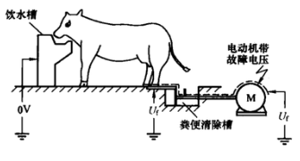 農畜房屋指牛棚、馬廄、豬圈、雞舍之類對電擊敏感的動物飼養場所和干草、麥秸等可燃物的堆儲庫房等建筑物,它屬畜禽電擊和火災危險場所。隨著我國電氣化飼養場的發展和農業電氣化水平的提高,農畜房屋的電氣事故也隨之增多。飼養設備,如飼料槽、自動飲水槽、糞便自動清除槽和各類管道多為導電的大型金屬導電件,容易傳導故障電壓。畜禽較人更易受電的傷害,接觸電壓大于25V 往往就可電擊致死。一些大牲畜的首尾和前后腳的距離大,容易同時接觸兩不同電位而招致電擊危險。如圖1一牛棚內自動清除糞便的電動機因絕緣故障帶危險電壓Uf。如圖中虛線所示,此電壓經一金屬傳動桿傳導至糞便槽的金屬槽框上。圖23-14中的乳牛后腳與帶電壓的金屬槽框接觸,而其嘴鼻則與帶地電位的金屬飲水槽接觸。電位差Uf將使被拴鎖的乳牛因無法掙脫,電擊致死 。