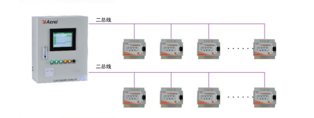 AFPM消防設備電源監控系統由AFPM100/B1型消防設備電源監控設備、電壓/電流傳感器和AKH系列電流互感器以及其他附件組成。系統各設備之間均采用二總線進行連接,施工布線簡單方便。