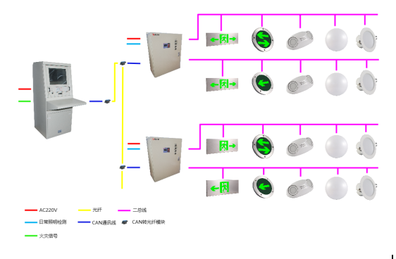 消防應急照明與疏散指示系統由控制器(主機)、集中電源和燈具(疏散指示燈具、應急照明燈具)等幾部分組成。