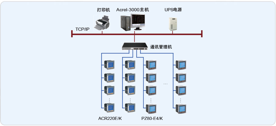 四川機(jī)械設(shè)計(jì)制造研究所主站層位于一層總值班室內(nèi),電力監(jiān)控系統(tǒng)的站控管理層設(shè)備具體包括:Acrel-2000電力監(jiān)控系統(tǒng)工控機(jī)一套、打印機(jī)、UPS。負(fù)責(zé)將通訊管理層上傳的數(shù)據(jù)解包,進(jìn)行集中管理和分析,執(zhí)行相關(guān)操作、以及整個(gè)變配電系統(tǒng)的整體監(jiān)控。網(wǎng)絡(luò)通訊層設(shè)備的選型主要從兩個(gè)方面考慮,一個(gè)是用戶需求,功能實(shí)現(xiàn)方面;二是根據(jù)現(xiàn)場(chǎng)情況,綜合項(xiàng)目的費(fèi)用來考慮的。針對(duì)這個(gè)項(xiàng)目來說網(wǎng)絡(luò)通訊層設(shè)備采用性價(jià)比高的4口帶隔離的通訊管理機(jī)。兩路進(jìn)線選擇的是安科瑞生產(chǎn)的ACR220E/K網(wǎng)絡(luò)電力儀表;出線回路選擇的是安科瑞生產(chǎn)的PZ80-E4/K。