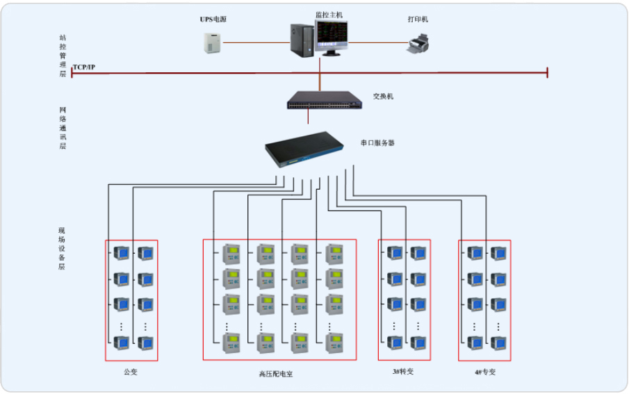 該項目由一個10KV高壓變電所,一個公變,以及兩個專變組成。該項目通過接入的21臺微機保護、50臺PZ96L-E4和兩臺溫控儀,監(jiān)測配電安全,保證變壓器在安全范圍內(nèi)運行。通過專變和公變的同時監(jiān)測,監(jiān)測整個工廠的耗能情況,確定高耗能范圍,實施節(jié)能措施,筑建綠色工廠。
