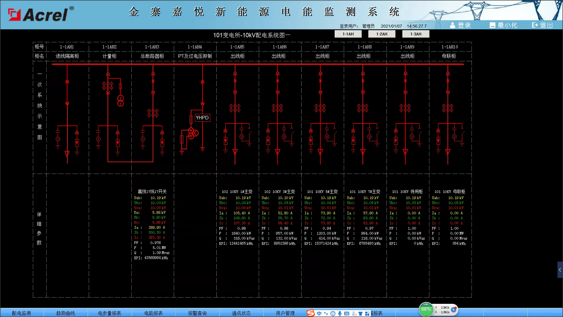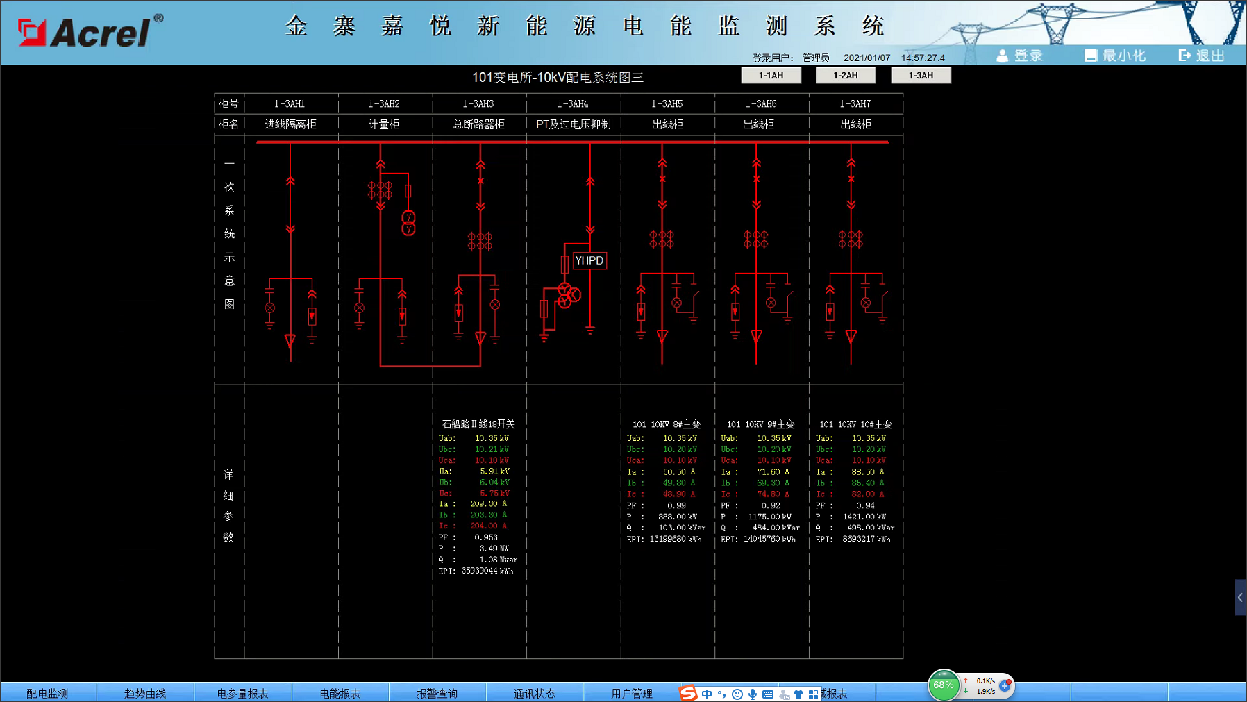 安科瑞Acrel-2000電力監控系統人機界面友好,能夠以配電一次圖的形式直觀顯示配電線路的運行狀態,實時監測各回路電壓、電流、功率、功率因數、電能等電參數信息,動態監視各配電回路斷路器、隔離開關、地刀等合、分狀態,以及有關故障、告警等信號。