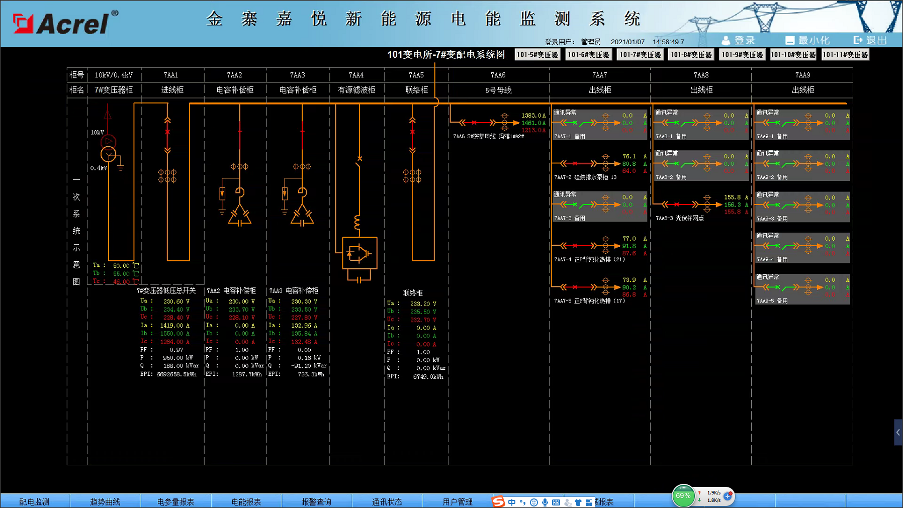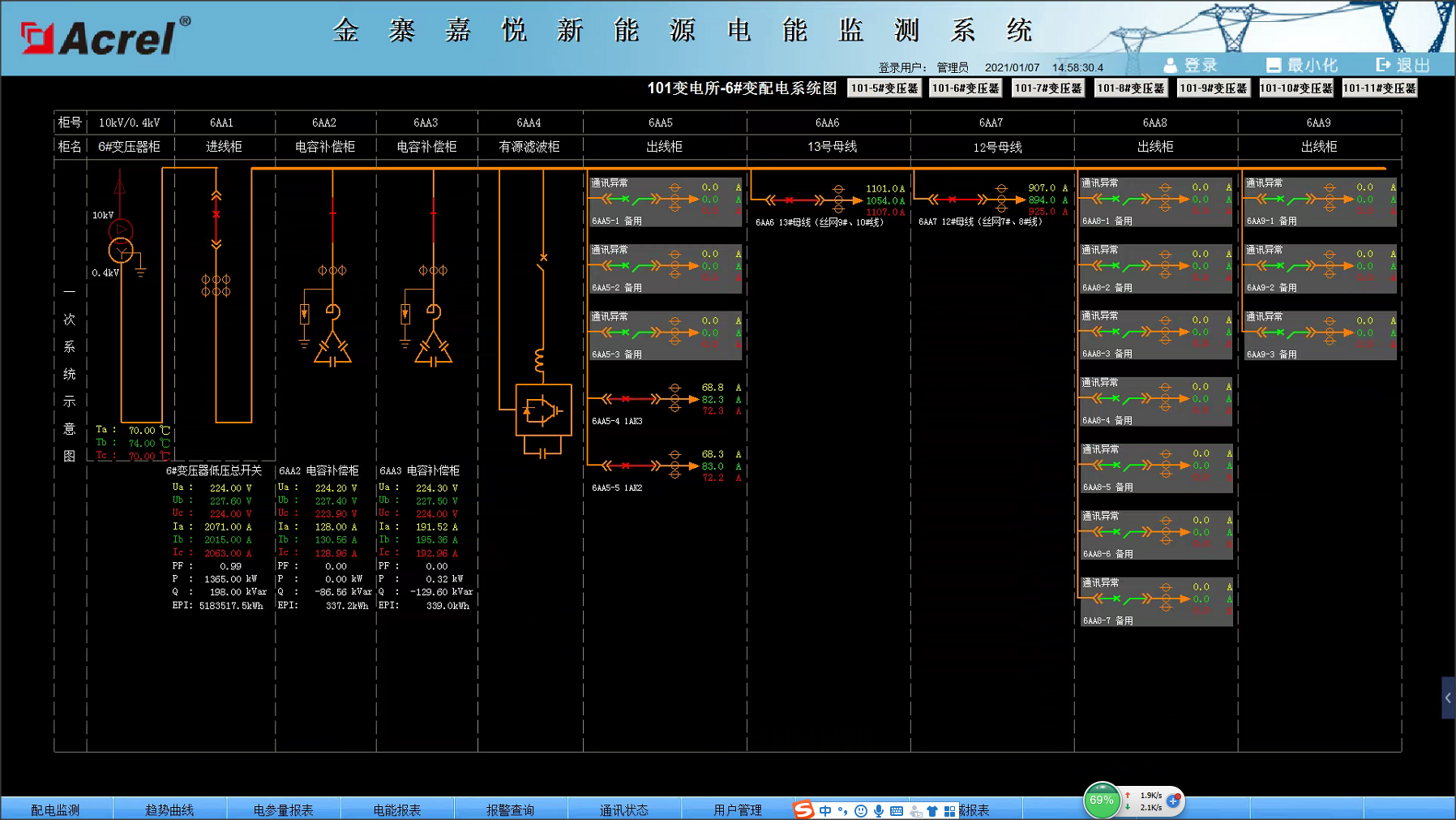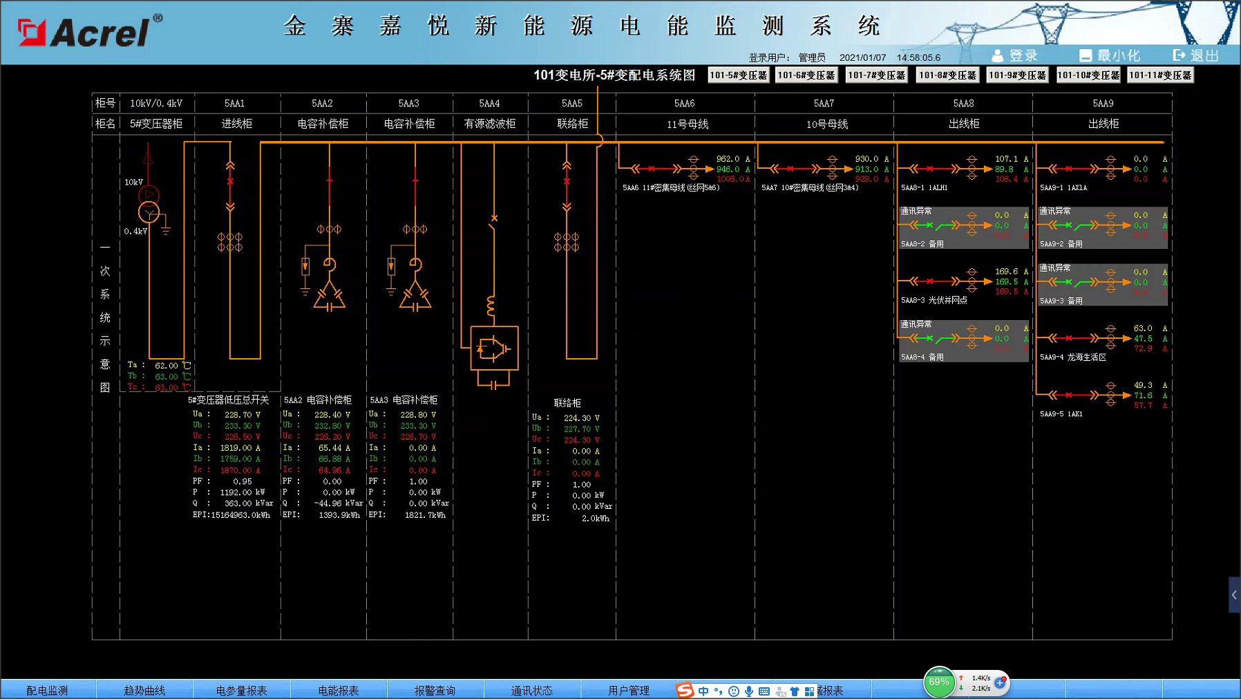 摘要:介紹金寨嘉悅電池片項目電力監控系統,采用綜合保護裝置、多功能儀表、變壓器溫控儀、直流屏,采集配電現場的各種電參量和狀態信號。系統采用現場就地組網的方式,組網后通過現場總線通訊并遠傳至后臺,通過安科瑞電力監控系統實現變電所變配電回路用電的實時監控和管理。