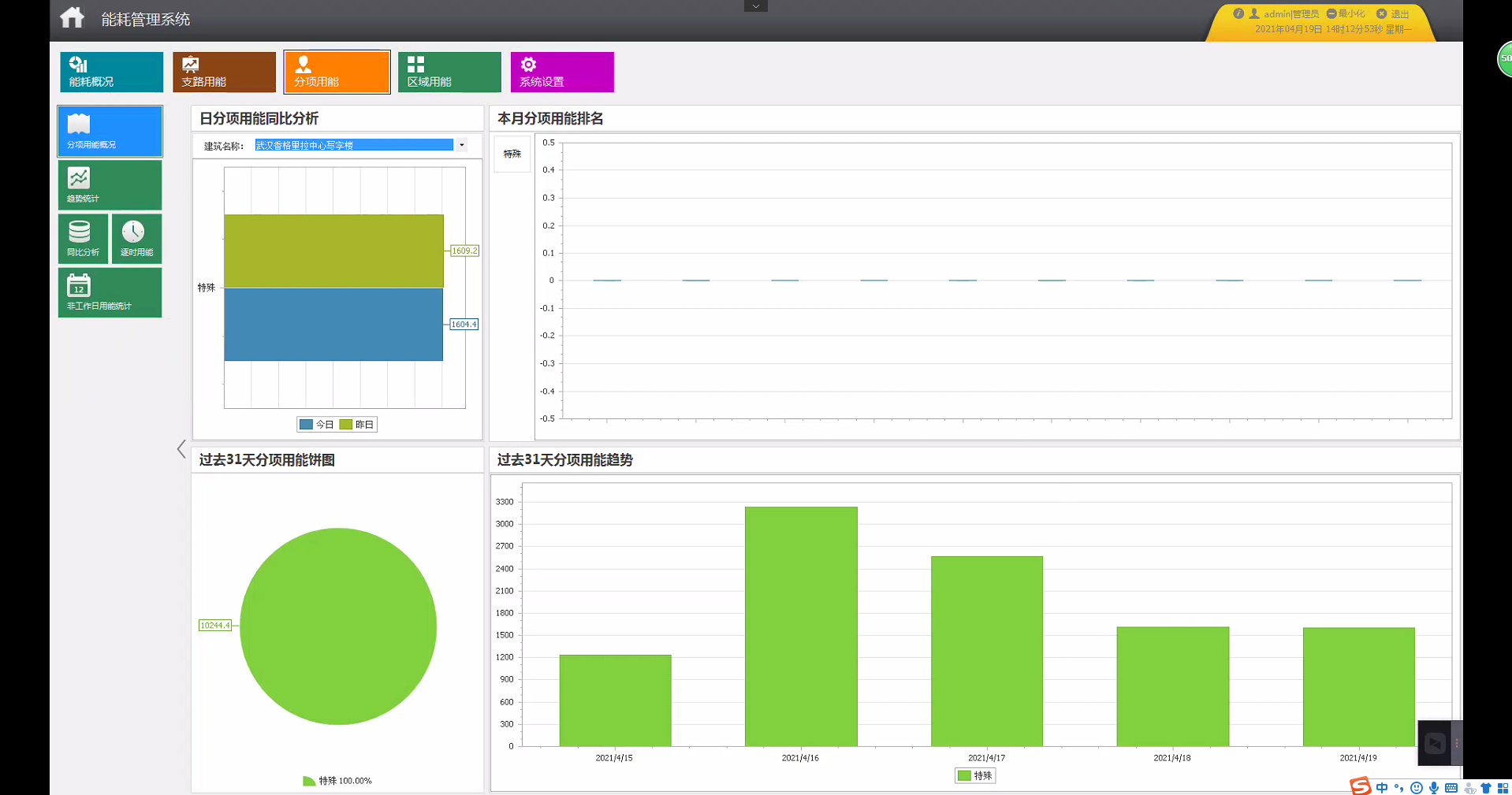 Acrel-5000能耗管理系統(tǒng)可以按照分項(xiàng)進(jìn)行能耗統(tǒng)計(jì)與顯示。其中,日分項(xiàng)用能同比分析圖顯示不同分項(xiàng)的當(dāng)日與昨日能耗柱狀圖(藍(lán)色柱表示今日,綠色柱表示昨日);用能餅圖顯示各分項(xiàng)過(guò)去31天的用能占比;堆積圖顯示各分項(xiàng)過(guò)去31天的能耗趨勢(shì);分項(xiàng)用能排名圖顯示被選中分項(xiàng)對(duì)應(yīng)能耗值排名前10位的支路。