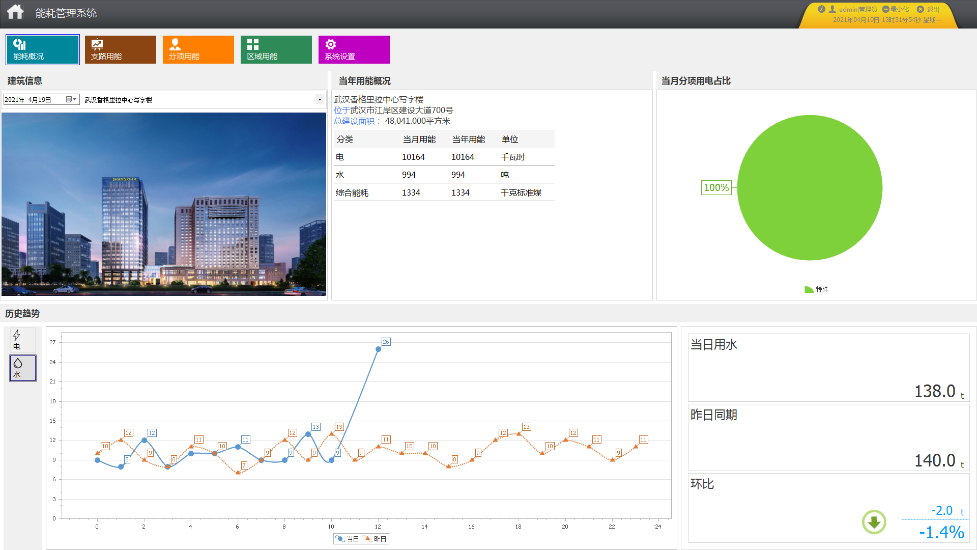 Acrel-5000能耗管理系統(tǒng)登陸成功進(jìn)入主頁(yè)面,主頁(yè)面顯示該建筑的建筑圖片,建筑基本信息,建筑當(dāng)月分項(xiàng)用電餅圖和各種能源的消耗量。根據(jù)所選的建筑,對(duì)其建筑圖片進(jìn)行加載,可以選擇時(shí)間查看建筑能耗情況,選擇建筑或時(shí)間后自動(dòng)刷新,默認(rèn)為當(dāng)天。
