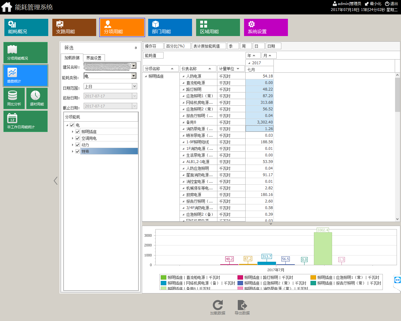 Acrel-5000能耗管理系統(tǒng)可以統(tǒng)計(jì)各分項(xiàng)某段時(shí)間內(nèi)逐日、逐周、逐月、逐季、逐年用能。選擇需要查詢的支路,‘加載數(shù)據(jù)’查看分項(xiàng)中各支路用能趨勢(shì),可根據(jù)已有的日期或者自定義時(shí)間進(jìn)行查詢。這里的支路都是通過(guò)基礎(chǔ)數(shù)據(jù)中分類分項(xiàng)的配置而來(lái),默認(rèn)查詢的是當(dāng)月的能耗。