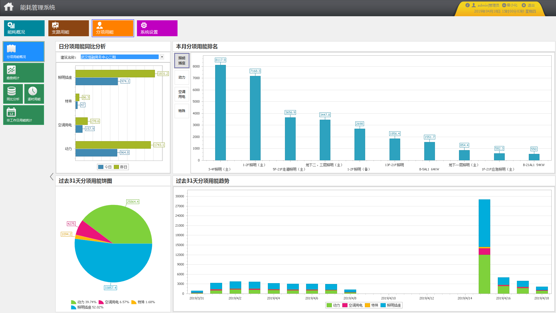 系統可以按照分項進行能耗統計與顯示。其中,日分項用能同比分析圖顯示不同分項的當日與昨日能耗柱狀圖(藍色柱表示今日,綠色柱表示昨日);用能餅圖顯示各分項過去31天的用能占比;堆積圖顯示各分項過去31天的能耗趨勢;分項用能排名圖顯示被選中分項對應能耗值排名前10位的支路。