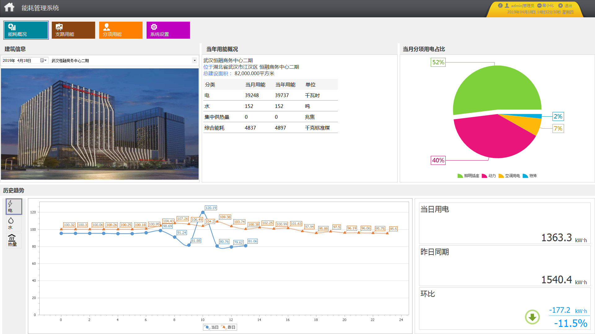 主頁面顯示該建筑的建筑圖片,建筑基本信息,建筑當月分項用電餅圖和各種能源的消耗量。根據所選的建筑,對其建筑圖片進行加載,可以選擇時間查看建筑能耗情況,選擇建筑或時間后自動刷新,默認為當天。