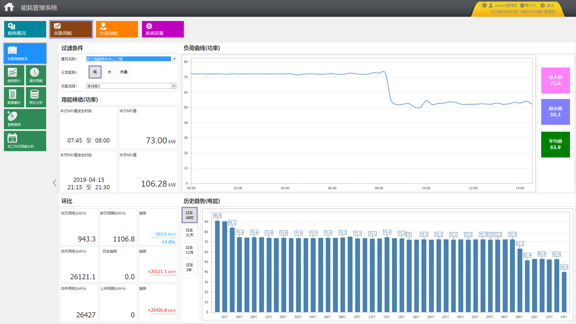 系統可以統計各支路某段時間內逐日、逐周、逐月、逐季、逐年用能。系統可查看各支路用能趨勢,可根據已有的日期或者自定義時間進行查詢,并可以將支路用能顯示合計,以圖表形式顯示。
