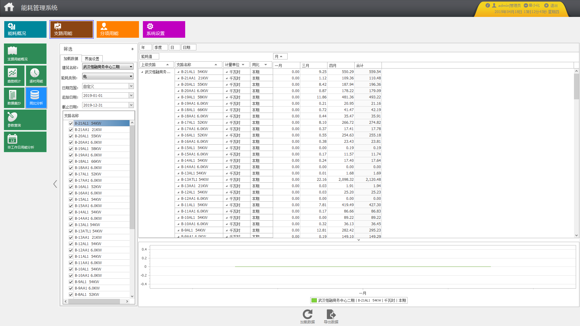 系統可將各主要耗能設備的能耗與去年同期值和上月值進行同比環比分析,檢驗節能效果,根據分析結果執行節能績效考核,以及節能目標的修正。統計各支路當年每月用能及去年同期用能;