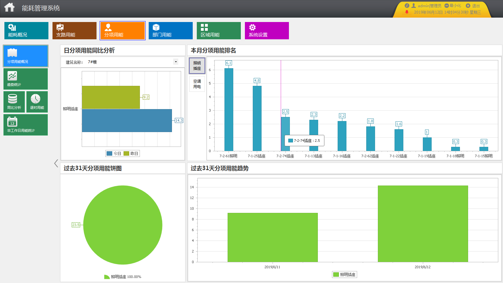 按照區域進行能耗統計與顯示。日分項用能同比分析圖顯示不同區域的當日與昨日能耗柱狀圖(藍色柱表示今日,綠色柱表示昨日)。以餅圖顯示各區域過去31天的用能占比,以右側堆積圖和柱狀圖顯示各區域過去31天的能耗趨勢。