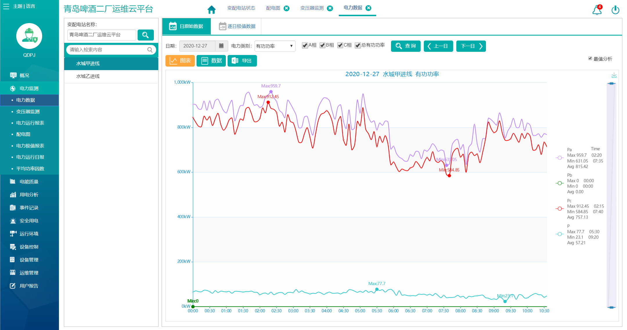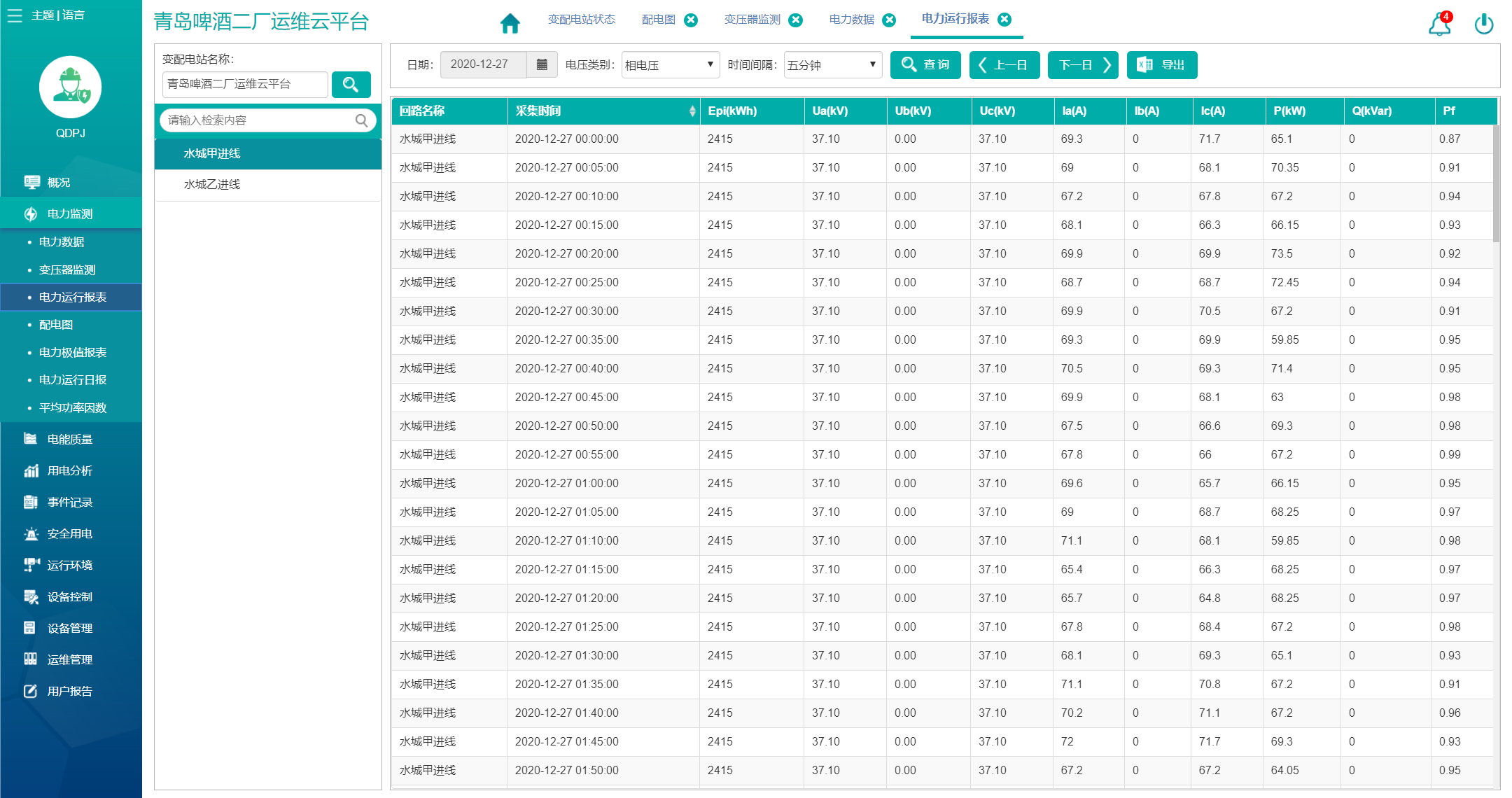 電力數據顯示變電所各回路的電力數據和曲線,包括電流、相電壓、線電壓、頻率、功率因數、有功功率、無功功率、視在功率等參數,并可導出圖表。
