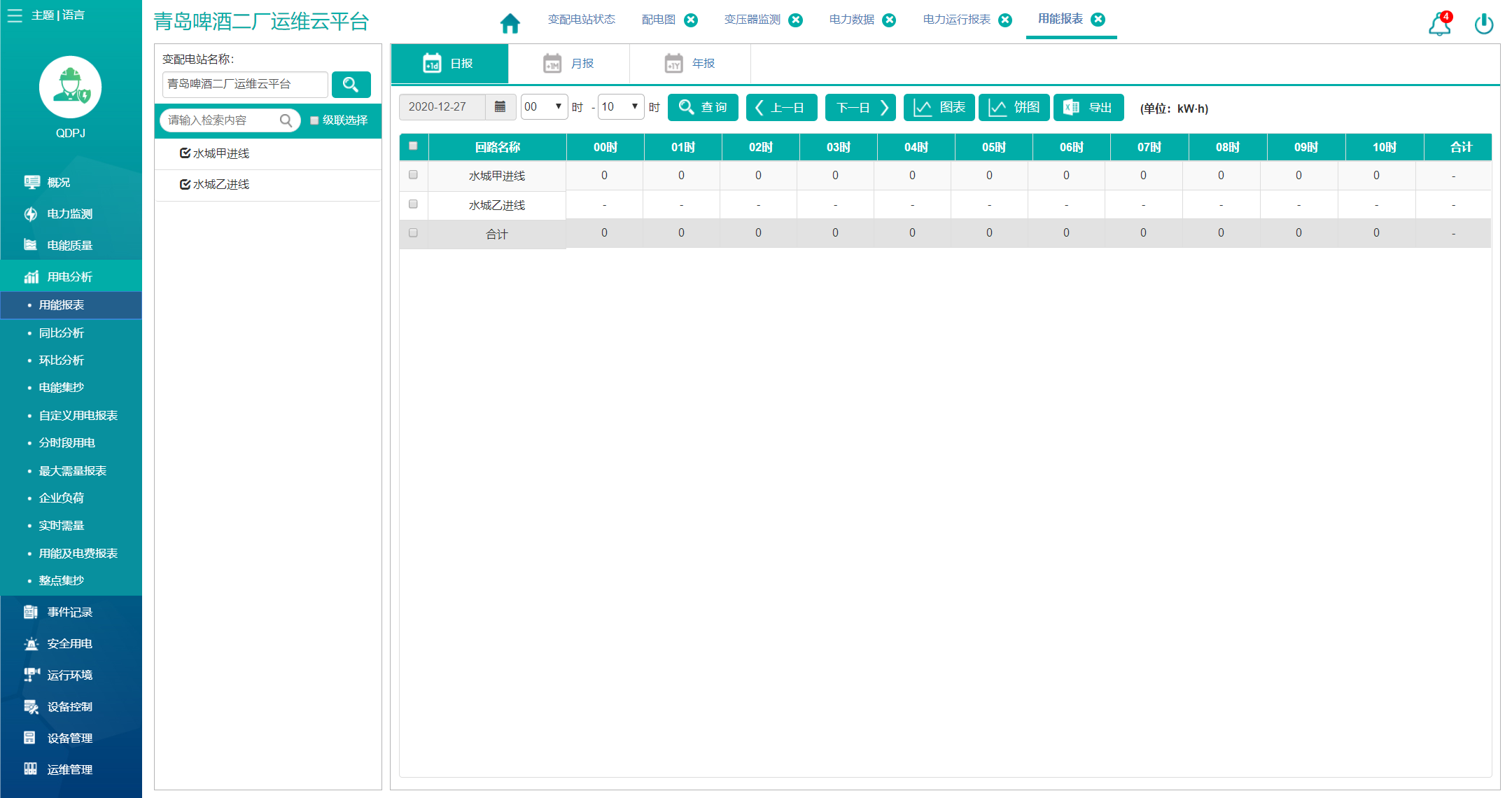 用電分析包括用能報表、同比分析、環比分析、電能集抄、計量及線路損耗。