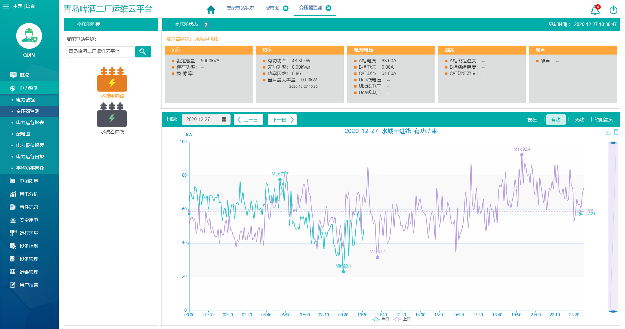“電力監控”頁面包括配電圖、變壓器監測、電力數據。