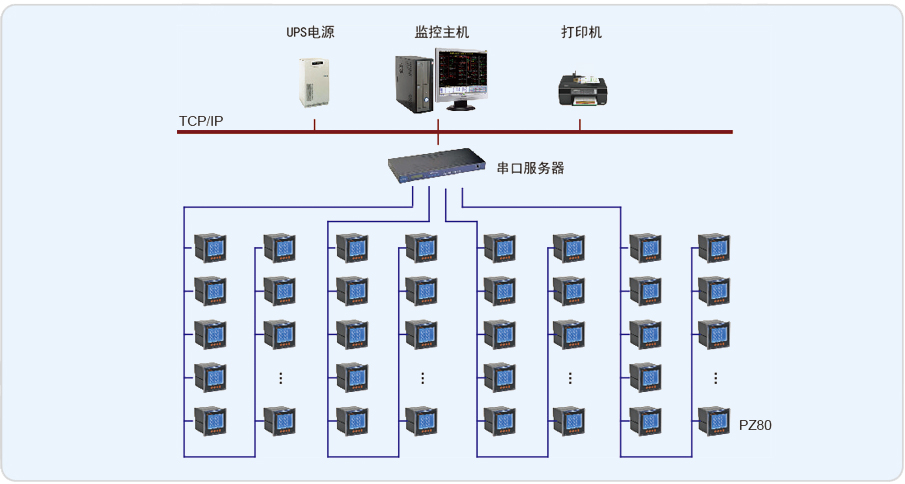本項目共有一個配電室,位于地下二層,本棟大樓所有供電均從該配電室配出。另外,本工程還配備一臺360KW柴油發(fā)電機組,作為備用電源,當市電停電時,從變電所市電開關輔助接點取發(fā)電機自啟動信號至發(fā)電機組,發(fā)電機組自啟動。在低壓配電,共有2兩路低壓配電進線,兩面電容補償柜,一面雙電源切換柜,53路出線回路以及聯(lián)絡柜。所有回路安裝安科瑞電氣股份有效公司的PZ系列可編程電測表,對本回路用電情況進行實時采集、處理。