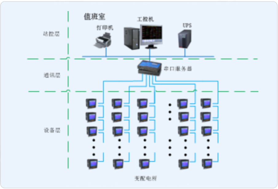 本項目設計為變配電所部分電力監控系統,變配電所位于地下一層,其中有兩路高壓進線,配有綜合保護裝置,低壓部分,進線柜、饋線柜配有儀表,本電力監控系統監控范圍為低壓部分裝置。通過組建系統網絡,電力儀表通過現場總線直接接入變電所內采集設備,并將數據上傳至Acrel-2000電力監控系統,實時監測變電所內各個回路的電流、電壓、功率、開關狀態等電參量,由此達到變電所少人值守或無人值守的智能化管理。