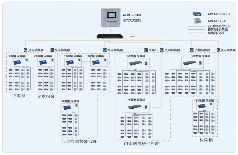 系統采用Acrel-6000電氣火災監控系統,整個系統采用網絡分布式結構,監控主機位于消控中心值班室門診一層,其余9個數據采集箱分布在行政樓、門診病房樓、食堂宿舍樓、感染樓,現場采用安科瑞ACRM系列漏電火災儀表。所有監控設備均通過屏蔽雙絞線至各自數據采集箱的通訊管理機,再通過光電轉換器經過光纖將數據傳輸至消控中心值班室門診一層,從而實現遠程監控。
