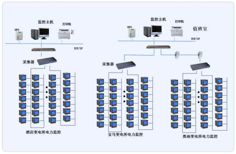本項目根據管理區域設置兩套Acrel-2000型電力監控系統,系統采用網絡分布式結構,其中寶馬奧迪主機設置在地下配電值班室,酒店設置在一樓值班室。所有配電回路均配備安科瑞電力儀表PZ系列。該項目實現了3個變電所內電力系統的智能管理。所有監控設備均通過屏蔽雙絞線至各自配電室內的通訊管理機,從而實現遠程監控。