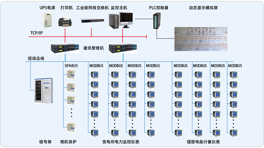 整個(gè)系統(tǒng)采用網(wǎng)絡(luò)分布式結(jié)構(gòu),監(jiān)控主機(jī)位于地下一層變電所值班室內(nèi),各變電所配電柜內(nèi)安裝有本公司ACR330ELH、ACR220EFLK儀表共計(jì)200多回 路,第三方設(shè)備共計(jì)200多臺(tái)。系統(tǒng)采用開放的通訊協(xié)議,通過現(xiàn)場(chǎng)總線與高低壓配電系統(tǒng)、變壓器溫控裝置、直流屏、模擬屏實(shí)現(xiàn)數(shù)據(jù)通訊功能。同時(shí)監(jiān)視系統(tǒng)提供標(biāo)準(zhǔn)的RS485接口向上連接到BMS系統(tǒng)。