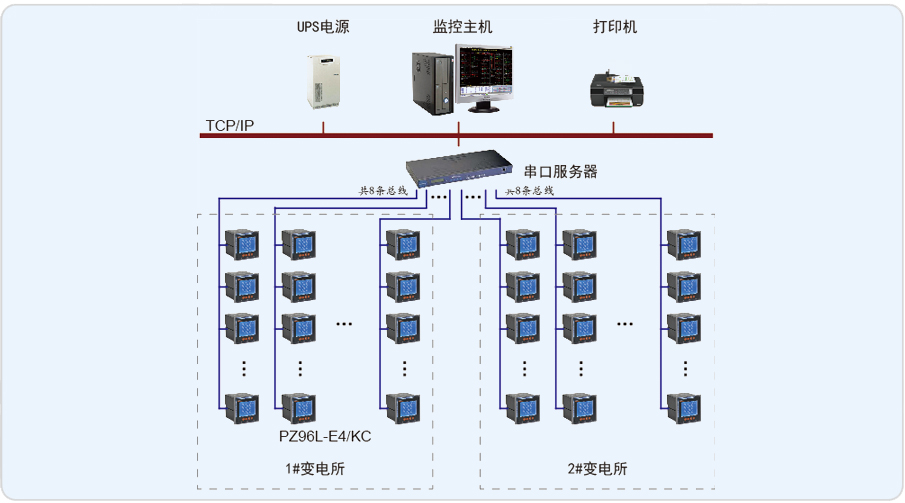 本項(xiàng)目現(xiàn)場2個(gè)配電室,即1#變電所和2#變電所,監(jiān)控值班室位于1#變電所,2#變電所與1#變電所之間相距大約500米。共180塊PZ96L-E4/KC網(wǎng)絡(luò)電力儀表。通過組態(tài)軟件Acrel-2000實(shí)現(xiàn)對現(xiàn)場儀表的實(shí)時(shí)監(jiān)測,并記錄歷史數(shù)據(jù)自動(dòng)生成報(bào)表,以便查詢。