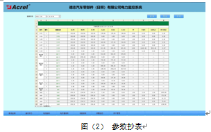 參數抄表功能,主要對低壓各出線回路的電參數進線查詢。支持任意時刻電參數查詢,具備數據導出和報表打印等功能。該報表查詢變電所4臺變壓器出線各低壓回路的電參數,主要包括:三相電流、有功功率和有功電度及變壓器溫度。該報表各回路名稱和數據庫關聯,方便用戶修改回路名稱。見圖(2)。