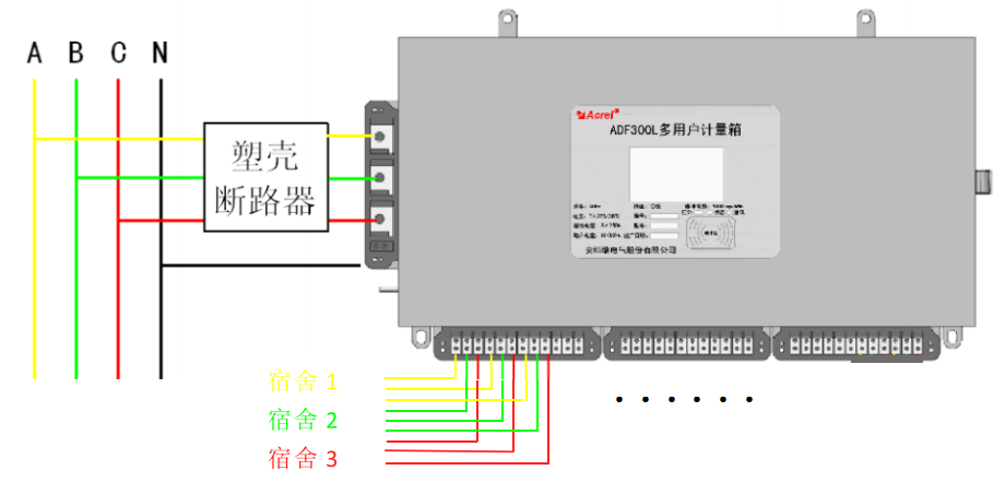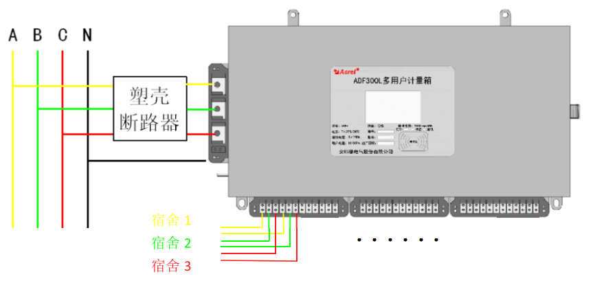 多用戶多回路解決方案一般適用于集中安裝的環境,箱體集中安裝于樓層配電間,然后根據需求可以每個寢室引入兩個(或三個)回路,實現分路計量、分路控制,大大提高惡性負載識別的準確性,降低誤判的概率,實現高校宿舍用電規范化、安全化管理,其接線圖如下圖所示。