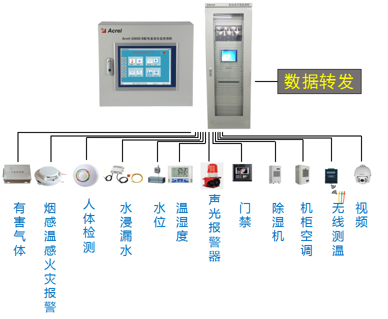 安科瑞電氣股份有限公司根據配電室實際情況,結合多年的變電站和配電室的運行管理經驗,自主研發了Acrel-2000E配電室綜合監控系統系列化產品,通過采集配電室的溫濕度、水浸、煙感、門禁、氣體和視頻等相關數據,及時掌握配電室現場情況,通過可靠的聯動策略實現系統的有機集成,有效解決了視頻監測、環境監測、安全警衛、門禁、消防和智能控制之間的互聯互通,降低了系統的建設成本。